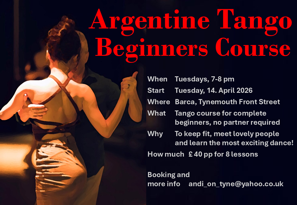 The next event is on the 31st March. Milonga ArgenTyne is an informal practice followed by a social dance (milonga). Everyone is very welcome do dance or just watch. You can grab a drink in the pub downstairs and join the dancing upstairs.